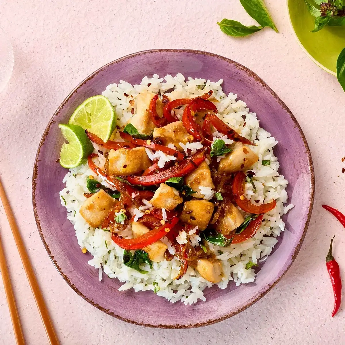 Turn chicken night into a Thai feast, with this saucy, 25-minute meal. A simple stir-fry packed with colorful veg and tender mouthfuls of chicken, this dish is enriched with a simple sauce made of fish and soy sauces, brown sugar, and lime.