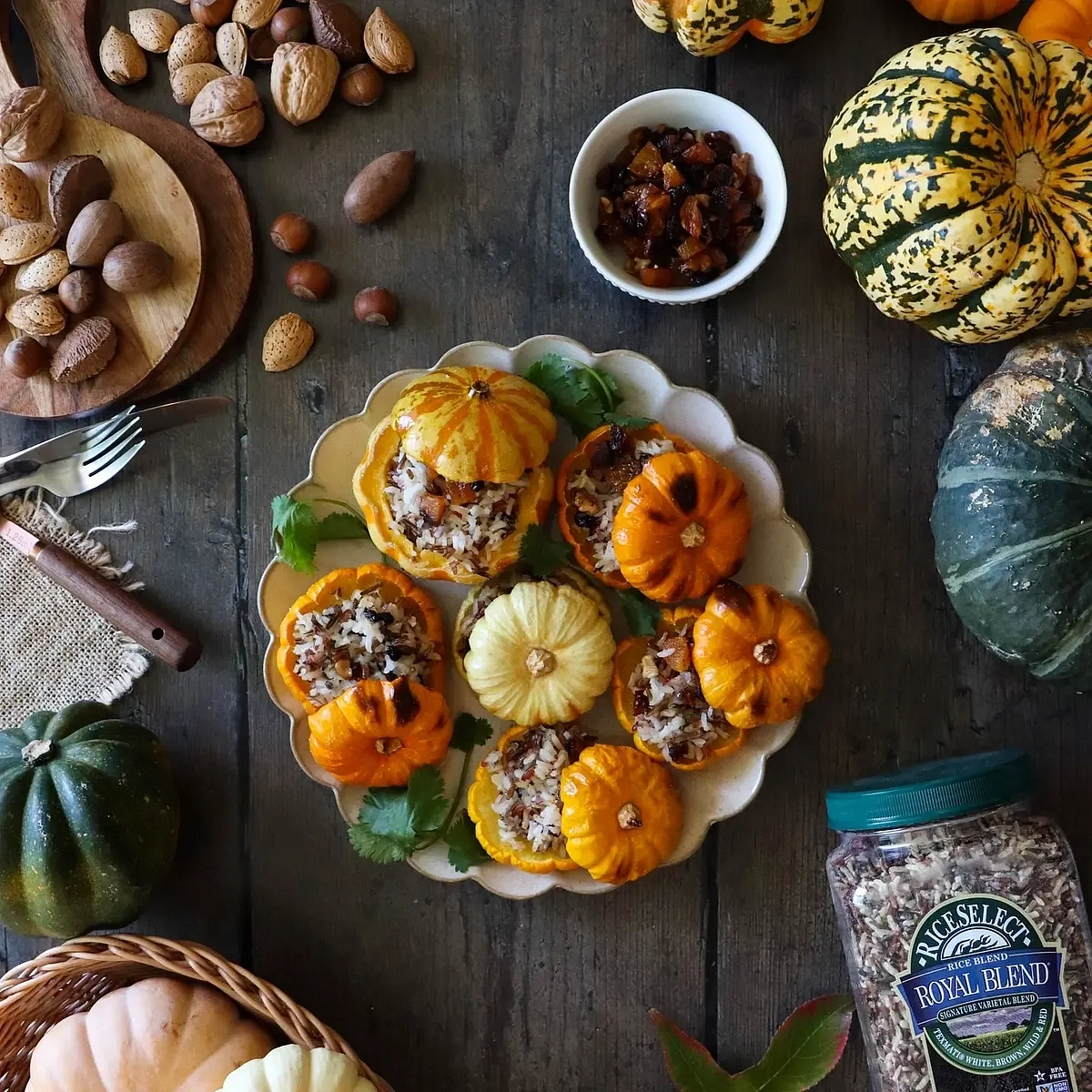 Rice Stuffed Mini Pumpkins with Dry Fruits and Pecans Recipe is a combo of flavors which also include cinnamon, nutmeg raisins and apricots.