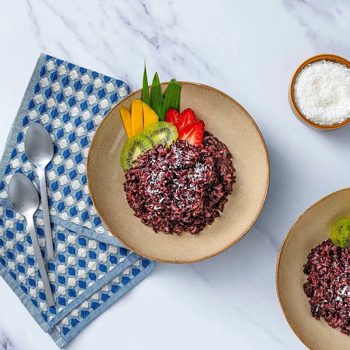 Few ingredients grab diners’ attention quite like RiceSelect® Black Rice. Delectably nutty, with a distinct dark color, it’s an ingredient that can turn any dish into something extraordinary. Here, it’s combined with pandan leaves, coconut milk, sugar, and fruit for a bold, delicious, gluten-free dessert everyone can enjoy.