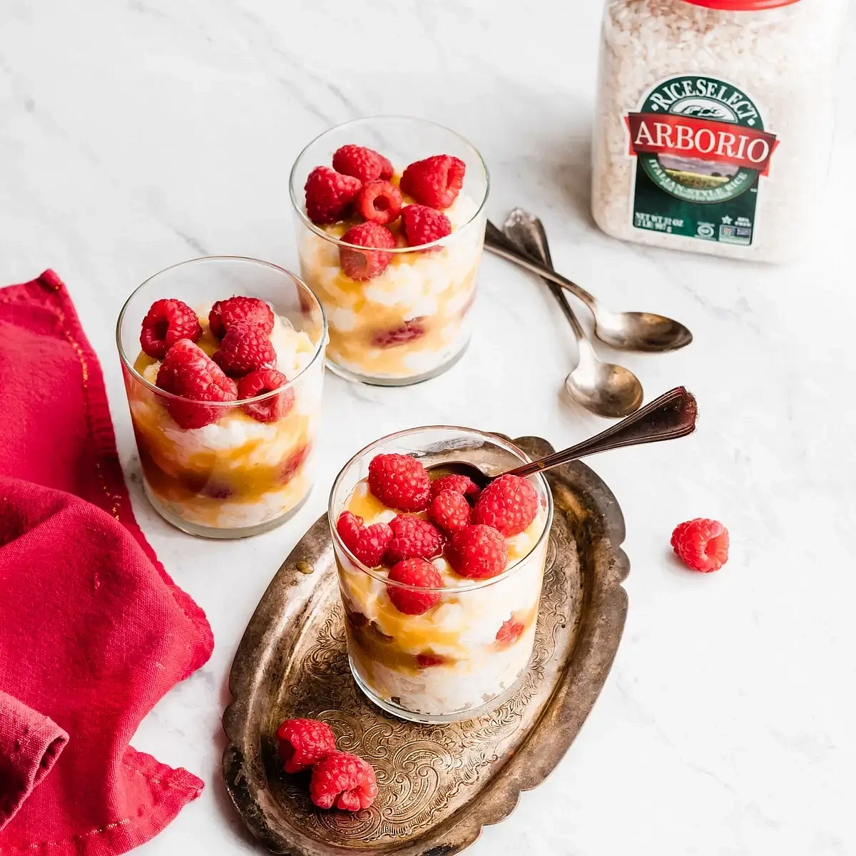 Need a stunner of a dessert for a party or get-together? Look no further than this lemon-scented, raspberry topped Italian cake. Bright and light, with a silky, sumptuous interior, it’s made with creamy RiceSelect® Arborio Rice, eggs, lemon zest and sugar.