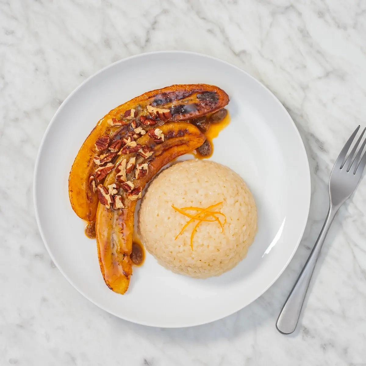 Buttery and sweet, tender, sugar-kissed bananas are good enough to eat by themselves. But we like to gild the lily by heaping them over tidy domes of sticky RiceSelect® Sushi Rice flavored with vanilla and cinnamon. Do we then add a flurry of toasted pecans and fragrant orange zest? Of course we do.