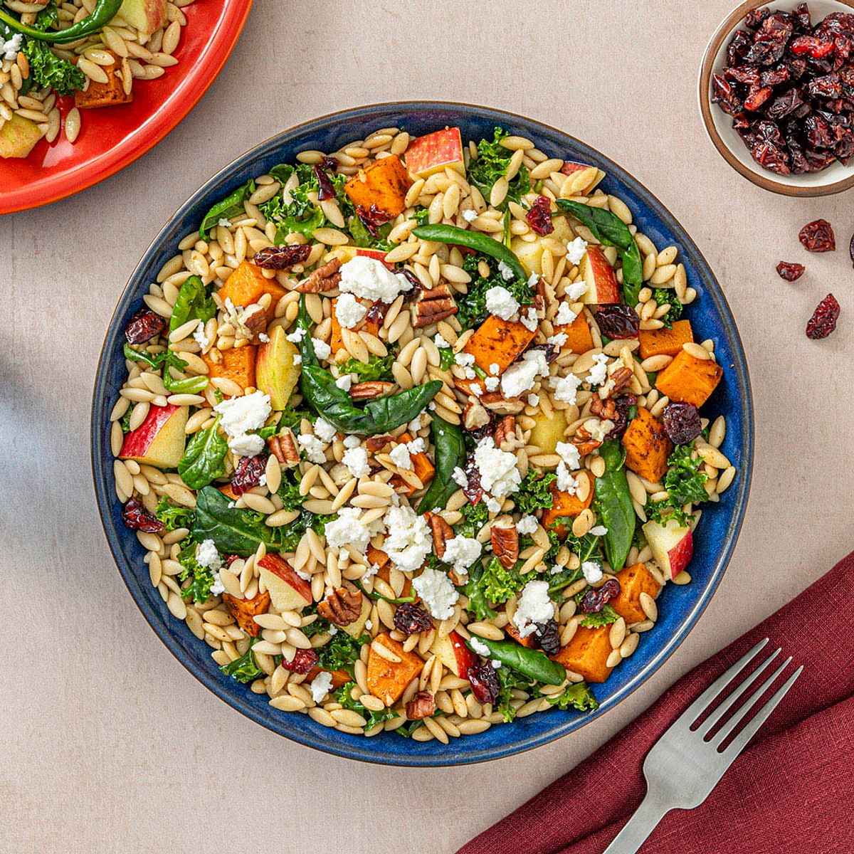 In a large bowl, combine orzo, sweet potatoes, baby kale, spinach, apple, cranberries, pecans, feta and dill. Toss with dressing.