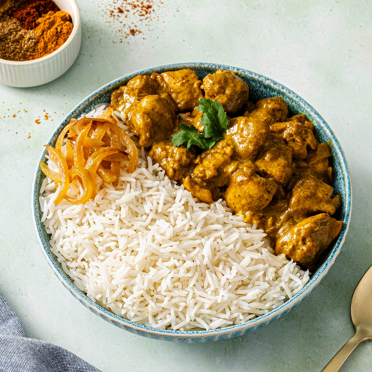 Stir in cumin, coriander, turmeric, garam masala, and chili powder. Cook for 30 seconds to release the aroma. Add chicken and stir to fully coat with the paste. Cook for 2 minutes or until lightly browned on all sides.