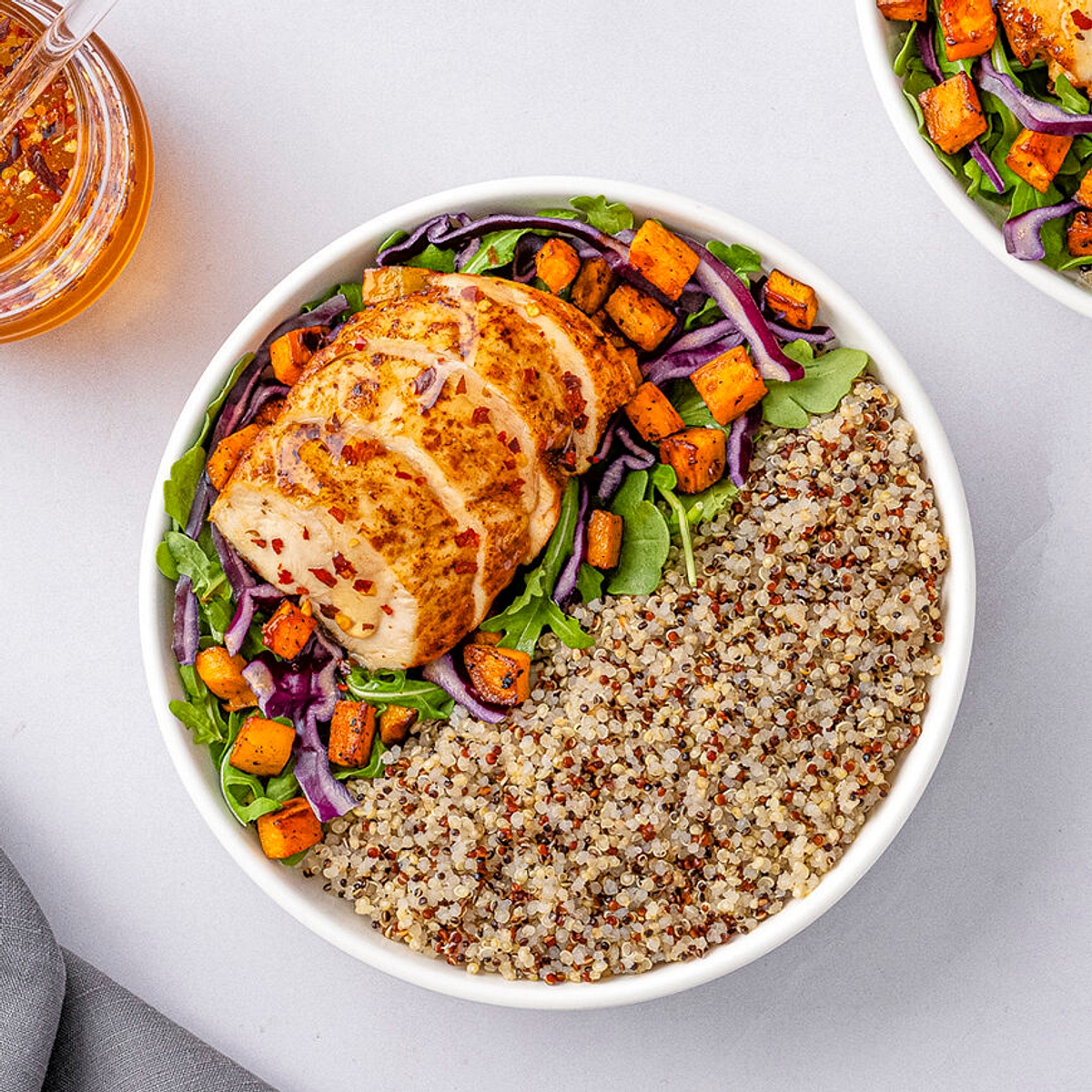 Divide quinoa between bowls, top with arugula, cabbage, sweet potatoes and chicken. Drizzle hot honey over chicken. Garnish with feta, if using.